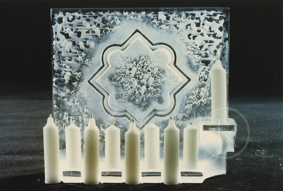 Chanuka Fotogalerie, Prodejní galerie uměleckého skla, Židovské motivy Judaica Jewish Art Glass Sculpture, Judaica, Skleněná plastikaJR 63 – Chanuka, 16×18 cm